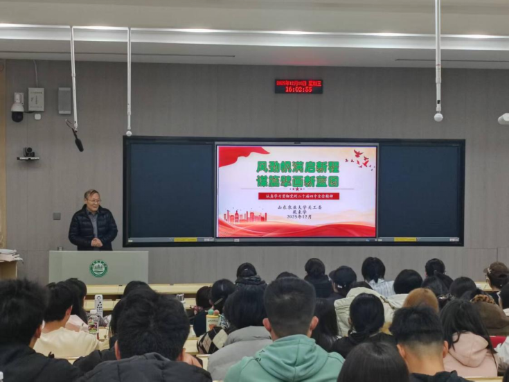 12月10日,学院于5N101教室举办党的二十届四中全会精神专题宣讲活动。本次活动特邀校关工委“五老”宣讲团成员苑来学老师主讲,学院党委副书记李平主持,全体2025级研究生、本科生参加。