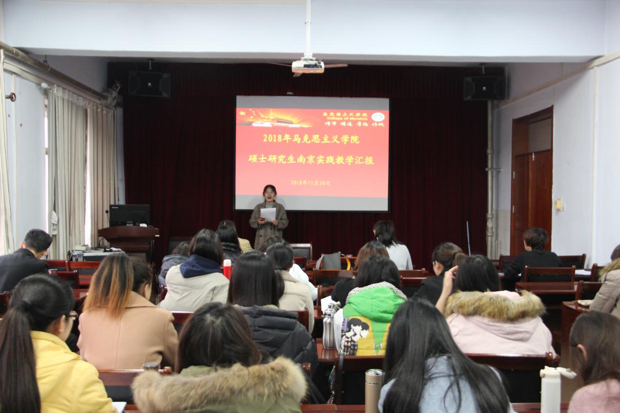 11月20日下午,马克思主义学院在学院报告厅举行了2018年硕士研究生南京实践教学汇报会。各个小组派代表汇报实践教学感悟、体会和收获。李国峰老师、李波老师、王露老师、马婷婷老师、陈慧文老师担任本次汇报会评委,2017级董睿同学主持汇报会,全体研究生参加。