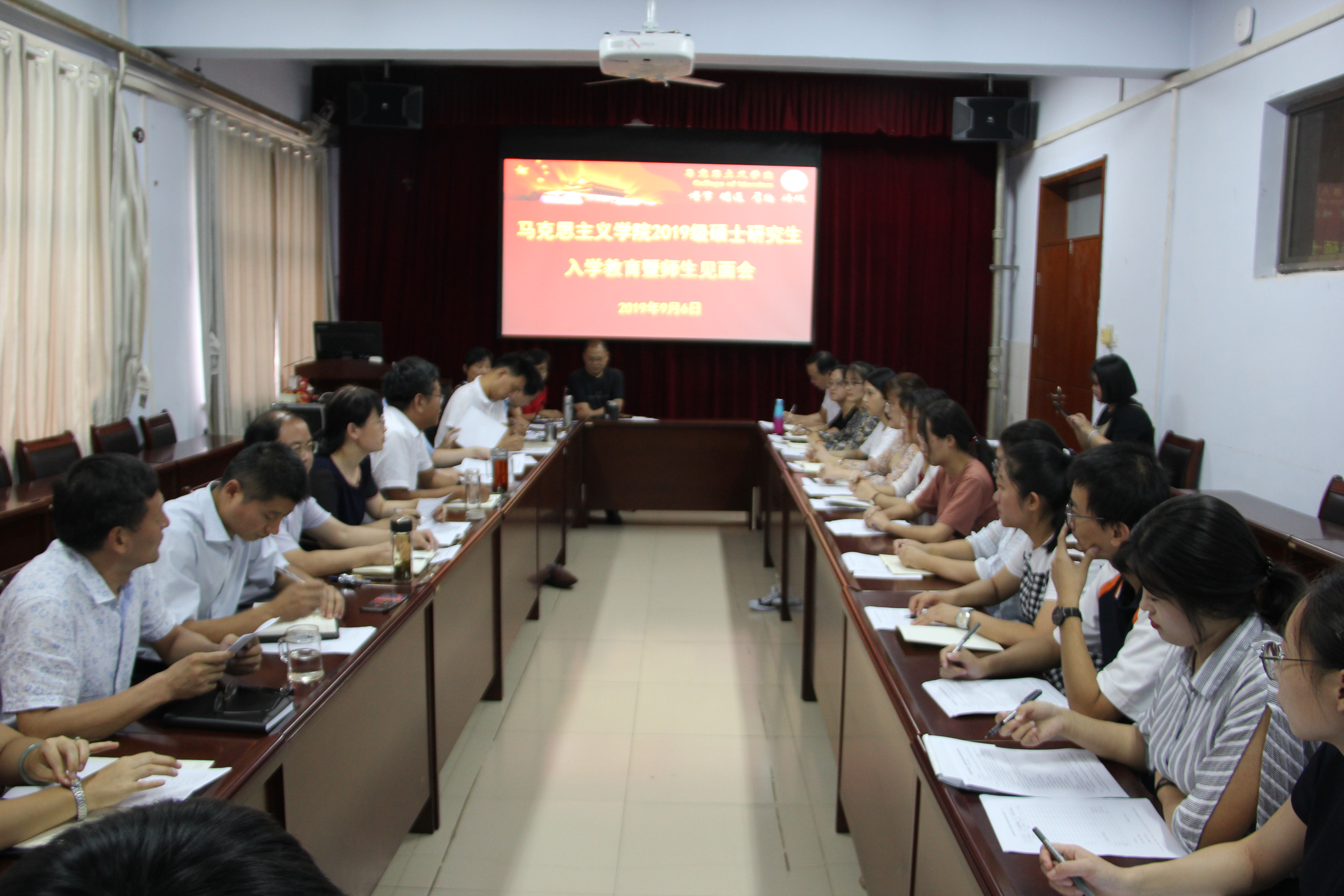 9月6日下午3点,马克思主义学院在8号楼508报告厅举行2019级硕士研究生入学教育暨师生见面会,学院党委书记傅臣家、副院长李国锋、全体研究生导师以及2019级全体硕士研究生参加了入学教育及见面会,副院长李波主持。