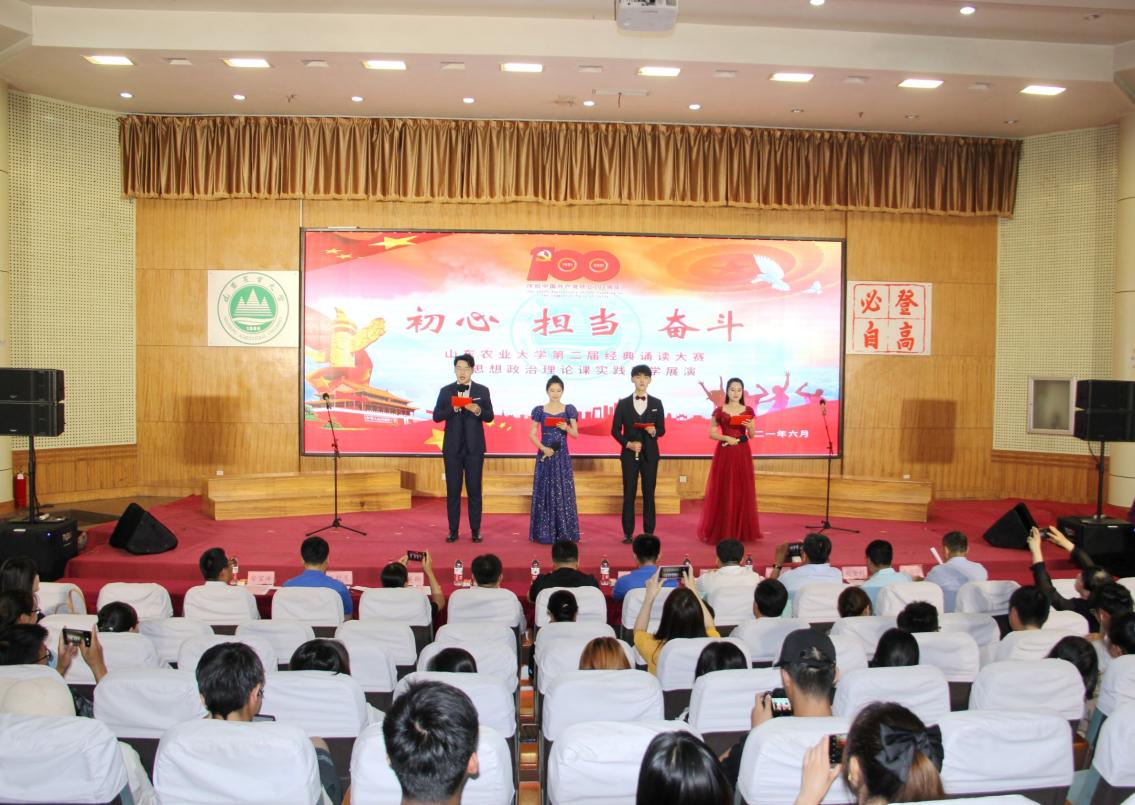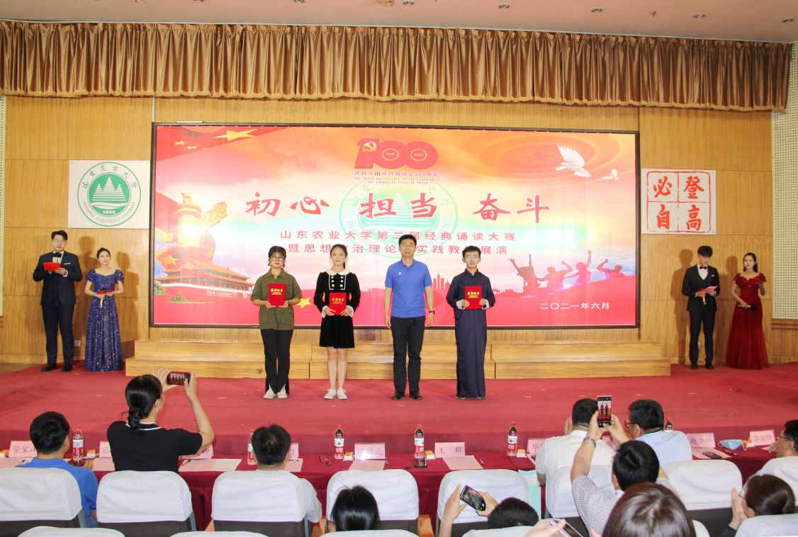 为庆祝中国共产党成立100周年,深入贯彻落实习近平总书记在党史学习教育动员大会上的重要讲话精神,6月5日晚上由宣传部、校团委、教务处、学工处主办、马克思主义学院承办的庆祝中国共产党成立100周年“初心 担当 奋斗”主题经典诵读大赛暨思想政治理论课实践教学展演在南校区图信楼学术报告厅举行。学工委书记、学工处处长、武装部部长王群,山东农大报社社长、党委宣传部常务副部长张铁成,马克思主义学院党委书记傅臣家,马克思主义学院院长林美卿,以及校团委、教务处等相关领导和老师出席大赛并担任评委。