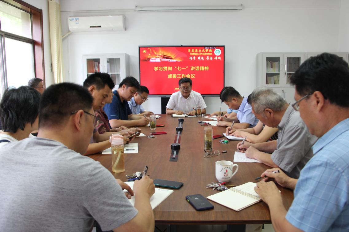 观看结束后,学院党委召开学习贯彻“七一”重要讲话精神部署工作会议,学院全体在家的领导、各支部书记、各教研部主任、教授委员会主任和办公室人员参加会议。会议由学院党委书记傅臣家同志主持。傅臣家提出了三点要求,第一,深入学习贯彻习近平总书记在中国共产党成立100周年大会上的讲话,深入学,反复学,带着思考学,用党的创新理论武装思想,武装头脑,做到思想一致、步调一致、行动一致,用思想理论的清醒推动政治上的坚定;第二,要学习习近平总书记讲话中蕴含的马克思主义基本原理,对于国之大计,对于新发展理念、新发展阶段、新发展格局和高质量发展提出的要求,在党的百年辉煌奋斗历程中汲取智慧和力量,牢记初心使命,坚定理想信念,践行党的宗旨;第三,要牢记马院姓马,在马言马,继续深入加强党史学习教育,站稳人民立场,内化于心,外化于行,坚定不移地推动思想政治理论课改革创新,坚定不移地加强理论宣讲,坚定不移地推动党的创新理论的诠释,努力建设好山东省重点马克思主义学院,展现出新马院在学校高水平高质量发展和冲一流建设中的担当,进一步凝心聚力,解放思想。