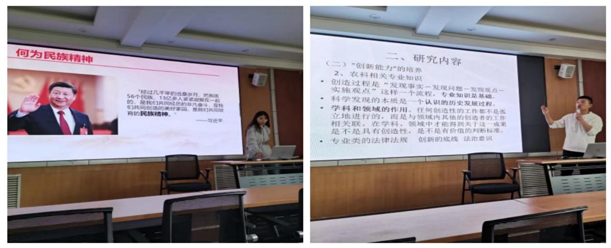 教研部还进行了集体备课和学术沙龙活动。青年教师王君钰、于颀分别进行教学展示与科研学术沙龙活动。王君钰展示的教学片段是《思想道德与法治》课第三章第一节“弘扬以爱国主义为核心的民族精神”,她从何为民族精神、正确把握爱国主义的基本内涵、内容拓展三部分入手,对爱国主义进行了讲解。于颀的科研学术沙龙活动围绕乡村振兴战略下农科生创新能力培养研究,从研究背景、研究创新点、研究内容、研究疑问等方面进行具体展开,并且就研究疑难点与老师们进行了讨论交流。