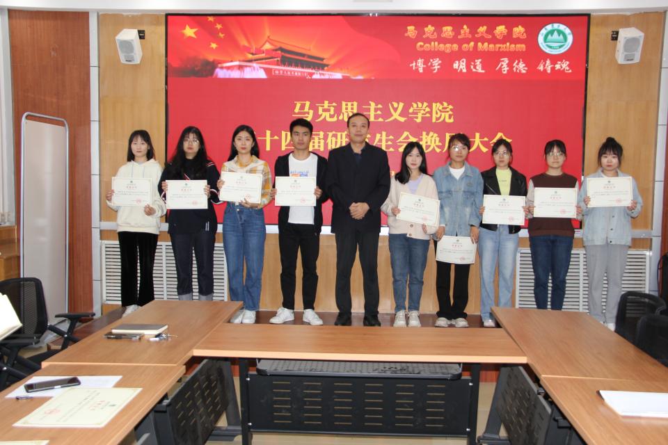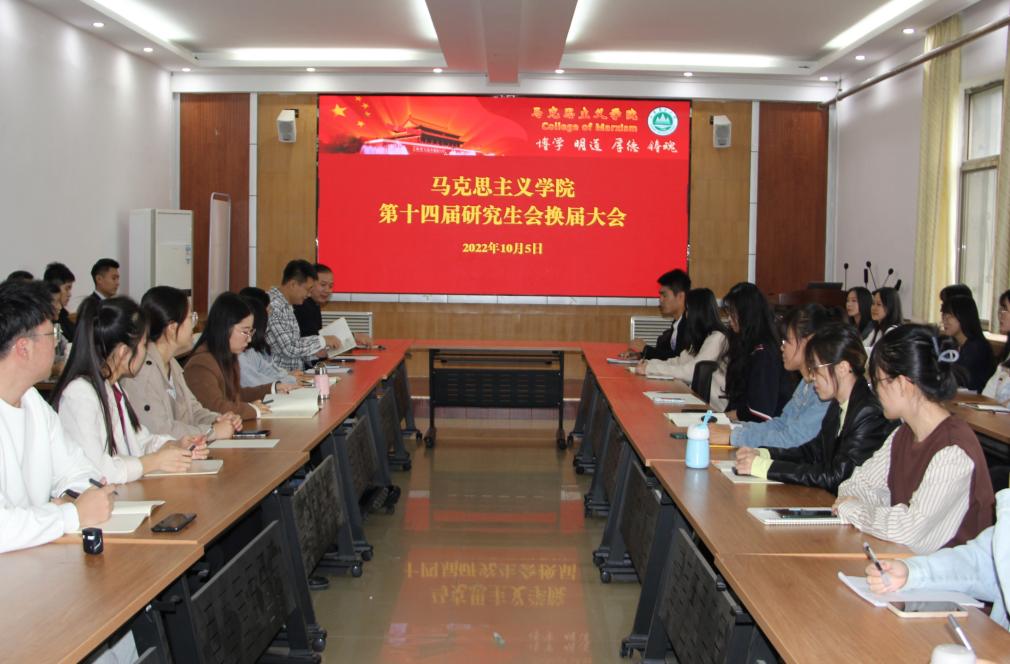 2022年10月5日下午三点,马克思主义学院第十四届研究生会换届大会在8号楼519学术报告厅举行。本次换届大会由第十三届研究生会主席赵孟磊主持,学院研究生辅导员李秋林老师和研究生会全体同学参加会议。