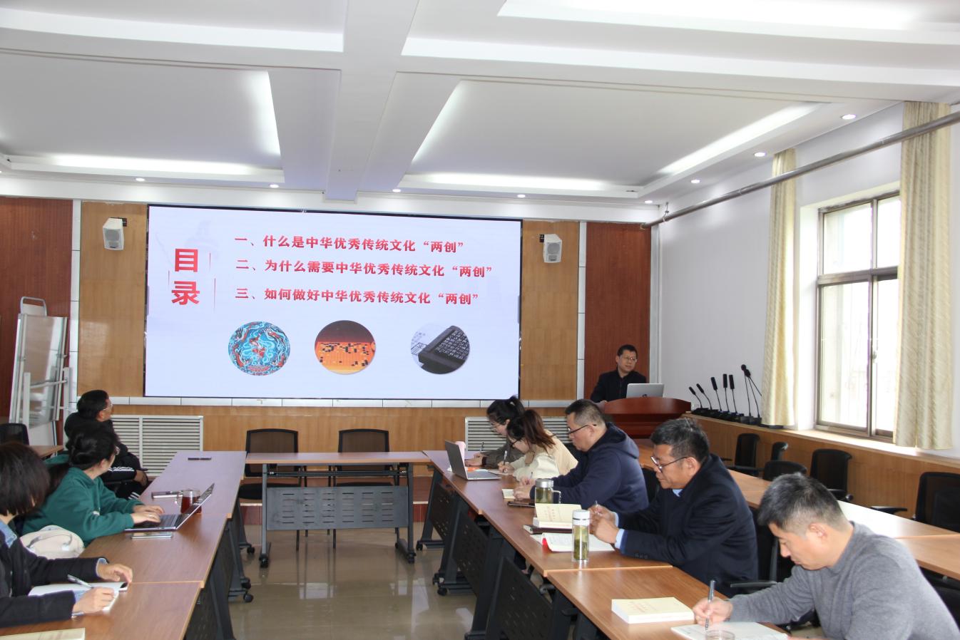 宣讲团骨干成员刘铭教授作了《中华优秀传统文化创造性转化和创新性发展》的主题报告,从什么是中华优秀传统文化的“两创”、为什么实现“两创”、如何做好“两创”三个逻辑维度展开,着重强调了中华优秀传统文化是中华民族的精神命脉,一定要坚持中国特色社会主义文化发展道路,建设社会主义文化强国。