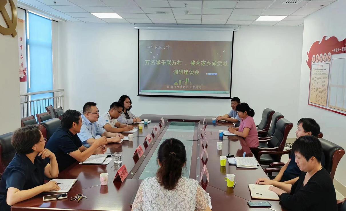在历城区农业农村局,李波院长首先介绍了山东农业大学近年来办学情况,并对本次调研活动的背景、目的意义和调研方式进行了解读。李波指出,“万名学子联万村,我为家乡做贡献”暑期大调研,是学校为推进主题教育走深走实,深入学习宣传贯彻习近平新时代中国特色社会主义思想和党的二十大精神,全面落实习近平总书记给全国涉农高校书记校长和专家代表以及给中国农业大学科技小院的学生回信精神而开展的一项重要工作。李波强调,此次调研活动将充分发挥山东农业大学掌握农业科技、熟悉“三农政策”的专业技术优势,根据调研中了解、收集到的有关资料,学校会逐步搭建起与乡村两级直接联系的桥梁,深度匹配农业需求,帮助农民增收致富、推动农业农村发展。