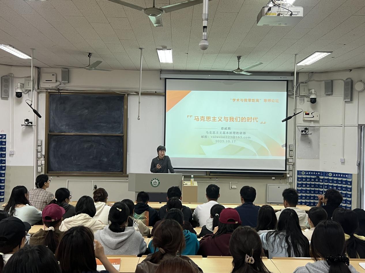 近日,学院在教学楼5N301举办“导师与我面对面”导师论坛,邀请学院青年教师、国家社科项目主持者蔡威熙副教授作题为“马克思主义与我们的时代”的学术报告。学院团委书记安莲主持报告会,2025级全体本科生和2024级转专业本科生参加活动。